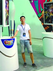 王志达在 ChinaJoy 布展期间与自己的展台作品合影。