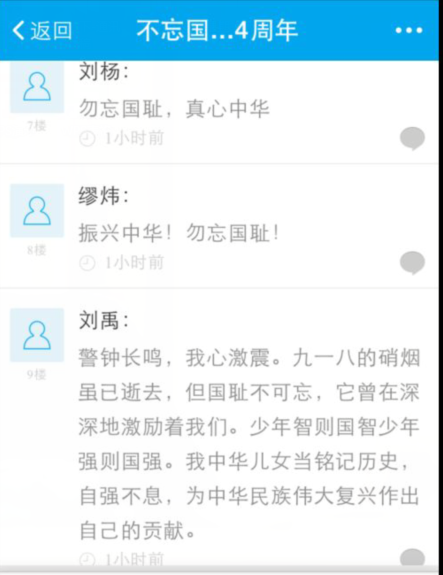 9月18日,材料学院新生班级建设工作基本完成,所有班级新成立的班团委在辅导员的带领下,在易班班群上展开了918 事件的在线讨论。所有同学都积极的参与进来,踊跃的发表自己对这一历史事件的看法。有的同学说:“今天的和平美好都是革命前辈的鲜血换来的,我们应不忘国耻……”,有的同学说:“我们永远不会忘记今天这个沉痛的日子,对于历史,忘却就算背叛……”大家纷纷表示要勿忘国耻,吸取教训,为祖国今后的发展尽力!