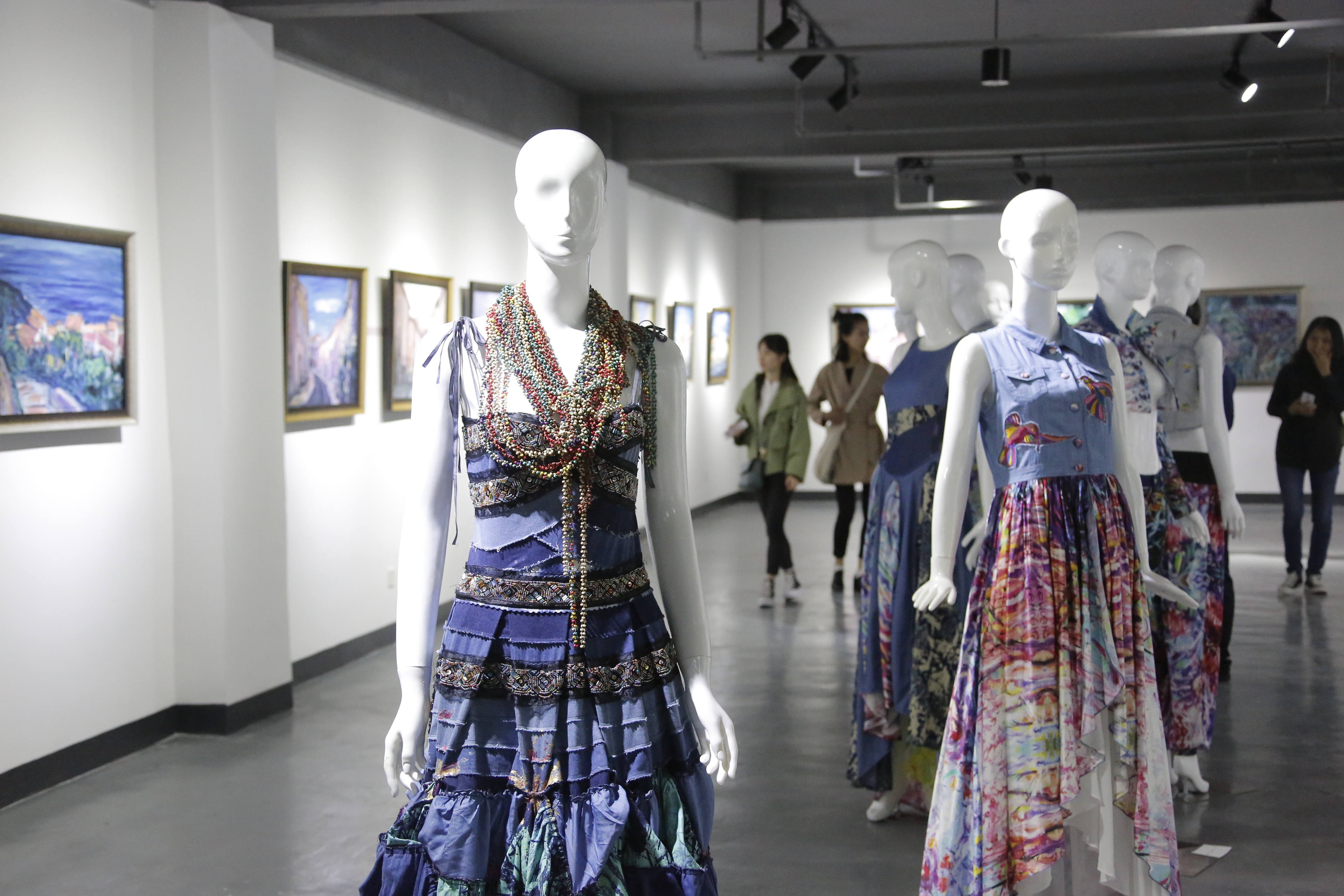 本次展览展出了陈闻先生的200余件作品,涵盖服装、油画、时装画三大内容,既有其2015年荣获中国时装设计“金顶奖”的作品,也有不少近年来的其他得意之作,从中可见其设计风格的演化轨迹。其中,陈闻先生的艺术牛仔最具代表性,他以牛仔布为载体,将多年来欧洲写生的体验绘制出一幅幅抽象的绘画,然后转换成图案印到牛仔面料上去,通过将这些带有抽象图案的面料与牛仔元素和工艺有机结合,从而创造出了一种具有时尚艺术特色的新的牛仔服饰风格。在这次艺术与时尚展中,陈闻先生以法国南部风土人情为题材创作的风景和人物油画也已经逐渐形成自己的风格特色,并且有很多画作在时装作品中进行了二次演绎。而他的时装画在他出道之初就小有名气,早在1991年就于上海美术馆举办过时装画展,本次展出的时装画,无论是作为服装的设计表达还是作为时装插画,均值得细观。展览将持续至5月28日,师生和市民均可免费入场观展。