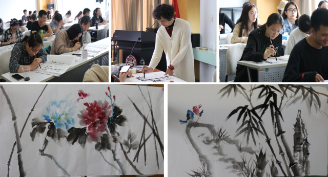 李谷娜系解放军艺术学院美术系副教授、中国画家协会理事、世界华人艺术家学会理事,画作曾获“庆香港回归书画作品展优秀奖”、“美国世界艺术中心第三届企鹅奖书画大赛银奖”等各大国际及国家级奖项,在各地均有展出。李谷娜为现场书画爱好者、老师和学生带来了细致生动的教学讲解,从绘画思想、绘画理念、绘画态度和绘画目标四个方面讲述了书画学习中的精神要领。学生张诗雯与李晓诠现场展示自己的绘画作品与书法作品,并向大家讲解画作灵感,李谷娜对两位同学的作品逐一点评并给出指导建议。李老师为大家讲解“墨分五色”,现场教授绘画牡丹、芍药、竹枝竹叶,师生们纷纷拿起毛笔在宣纸上跟随老师的讲解落笔辗转。李老师现场赠予题词“水墨丹青万古春”,并希望大家通过中国绘画学习古人精神,创造新时代的新作品!