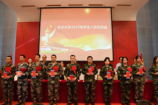 会上,刘淑慧宣读了我校2019年入伍学生名单。今年我校有44名学生积极响应祖国召唤,光荣参军。金海燕代表学校党政向即将告别校园、告别家乡的东华新兵表示祝贺,希望入伍学生在军营中,不忘初心、牢记使命,严守纪律、经受考验,矢志奋进、砥砺前行,传承光荣传统,坚定理想信念,以实际行动为校争光,回馈社会,为新中国成立70周年献礼。希望学院和相关职能部门继续关心在役学生。