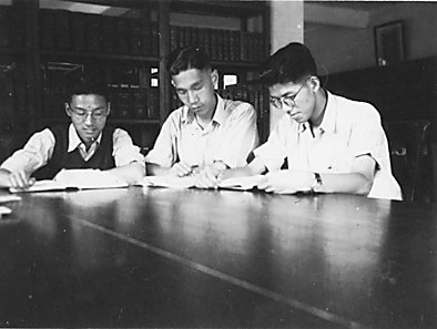 (1948年,郁铭芳(中)与大学同学在上海圣约翰大学图书馆学习。)