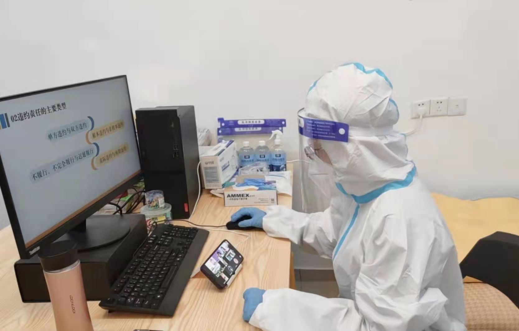 这些天,送饭大军突然“减员”了一位干将,原来她早已转战“前线”,人文学院的高伟老师主动报名担任了延安路校区15宿的驻楼志愿者。“想到同学们那一张张信任你、依靠你,又略带羞涩和紧张的稚嫩面孔,换做是任何一位老师都会报名参加的。”她一进入宿舍楼,就马上变身“大白”,投入到驻楼志愿服务……与此同时,她还要化身“主播”,为学生们线下备课、网上授课连轴转,电脑前的高伟看不出一丝倦意,正绘声绘色给同学们讲解着“合同法”课程案例。
